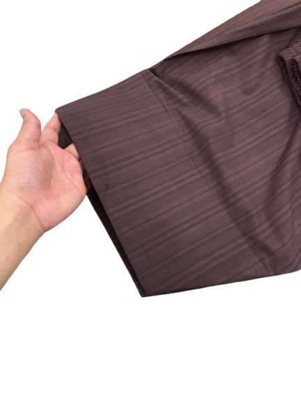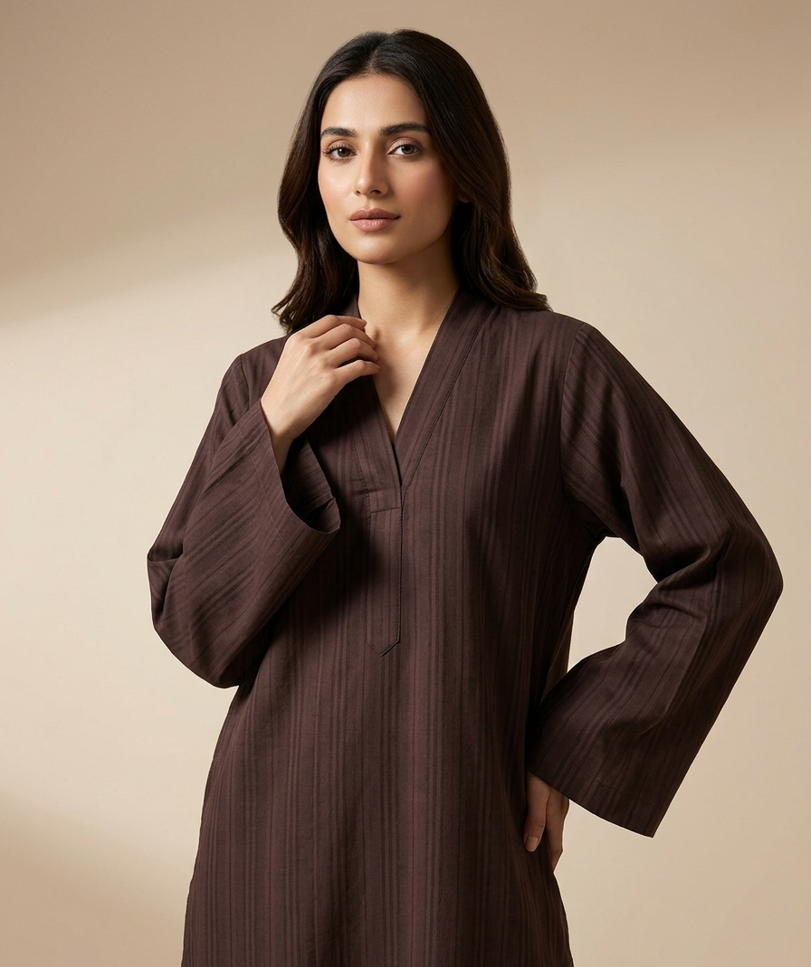 Step into elegance with our Brown Farshi Shalwar Kameez, designed for women who love minimal yet classy fashion. This outfit features a rich dark brown tone with subtle stripe detailing, giving it a sophisticated and timeless look.